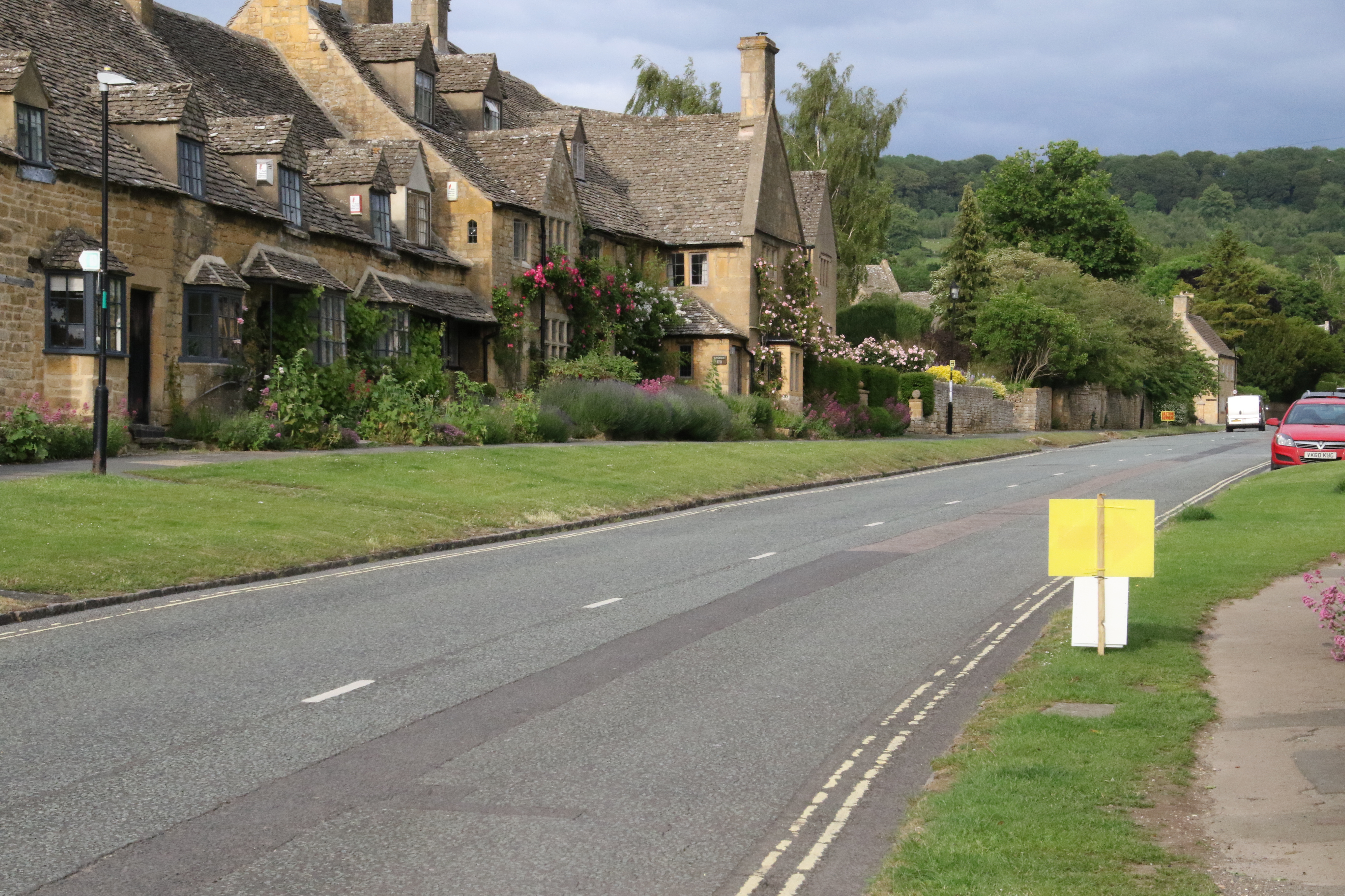 Wikipedia says "Broadway is a large village within the Cotswolds, situated in the far southeast of Worcestershire and very close to the Gloucestershire border. It is midway between the towns of Evesham and Moreton-in-Marsh. The village lies beneath Fish Hill on the western Cotswold escarpment. The 'broad way' is the wide grass-fringed main street, centred on the Green, which is lined with red chestnut trees and honey-coloured Cotswold limestone buildings, many dating from the 16th century. The wide High Street is lined with a wide variety of shops and cafes, many housed in listed buildings."